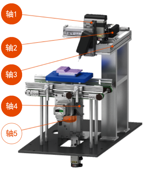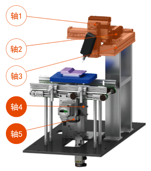 自動給由傳送帶搬送來的工件進行點膠。 通過升降旋轉模組將由傳送帶搬送來的工件上升旋轉至加工位置、利用直交機器人多軸模組(龍門架單元)處理各種尺寸及形狀的工件。 此次的裝置是利用點膠機進行點膠,也可用于其他用途。