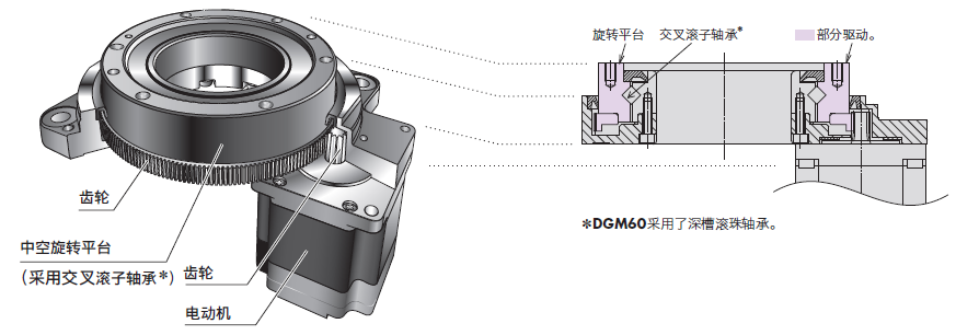 中空旋轉(zhuǎn)平臺(tái)的軸承采用交叉滾子軸承,實(shí)現(xiàn)了高負(fù)載與高剛性。(DGM60除外)