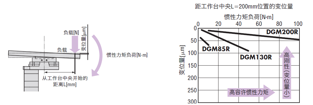 ◎距工作臺(tái)中央200mm的位置的慣性力矩負(fù)荷與變位量之間的關(guān)系