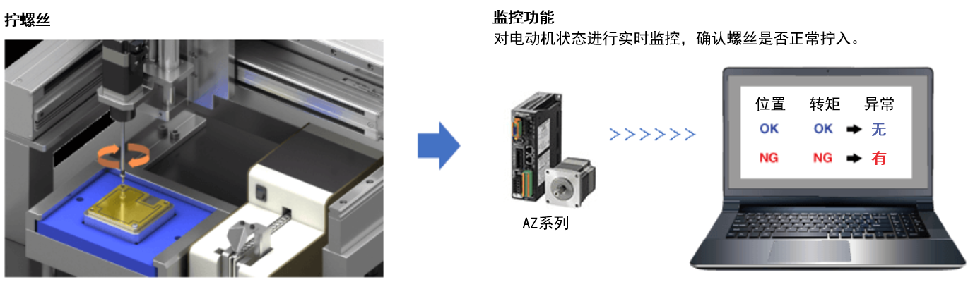 AZ系列可監(jiān)控電動(dòng)機(jī)的位置及負(fù)載率等。各項(xiàng)目的監(jiān)控狀態(tài)達(dá)到任意值時(shí),輸出信號(hào)。通過監(jiān)控功能可檢測(cè)出位置、轉(zhuǎn)矩變化等可能造成不合格品的裝置狀態(tài)及螺絲旋緊的異常。 而且,可從使用開始時(shí)監(jiān)控累計(jì)旋轉(zhuǎn)量,以往憑經(jīng)驗(yàn)的技術(shù)實(shí)現(xiàn)了可視化,有助于預(yù)知保全。
