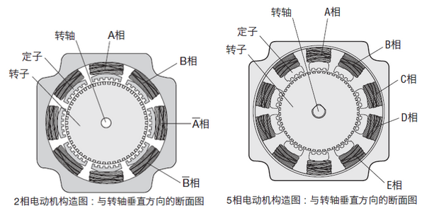 有A相至E相等5個(gè)相位的機(jī)型稱為5相步進(jìn)電動(dòng)機(jī)、有A相和B相2個(gè)相位的機(jī)型稱為2相步進(jìn)電動(dòng)機(jī)。