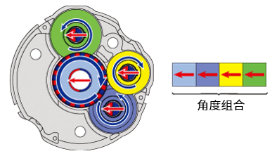 模擬時(shí)鐘根據(jù)秒針、分針、時(shí)針的位置測(cè)定當(dāng)前時(shí)間。ABZO編碼器相當(dāng)于搭載了4個(gè)相當(dāng)于時(shí)鐘時(shí)針的齒輪,通過識(shí)別這4個(gè)齒輪的角度來檢測(cè)位置信息。