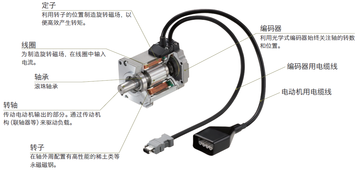 電動(dòng)機(jī)搭載編碼器,用于向驅(qū)動(dòng)器反饋電動(dòng)機(jī)軸的旋轉(zhuǎn)位置及轉(zhuǎn)速。