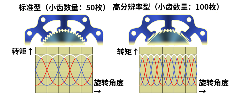 與標(biāo)準(zhǔn)型相比,齒輪更密,齒數(shù)更多。通過(guò)分散發(fā)生轉(zhuǎn)矩的偏差,減小靜止角度誤差。