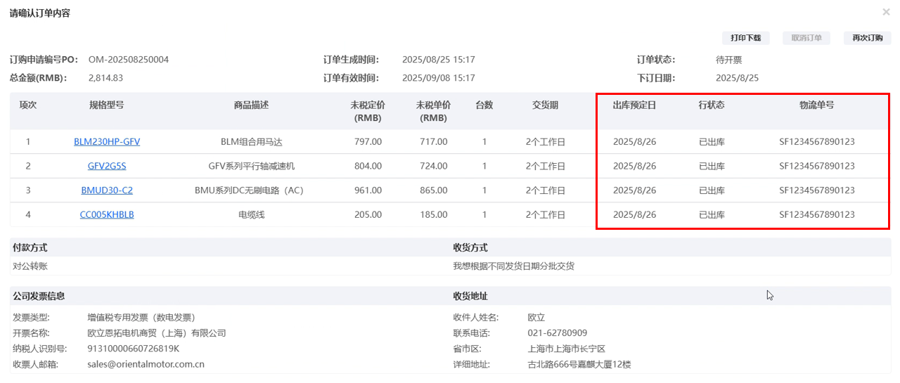 ③ 進(jìn)入訂單詳情,您可以查看最新的“預(yù)定出庫日”、“行狀態(tài)”和“物流單號(hào)”。