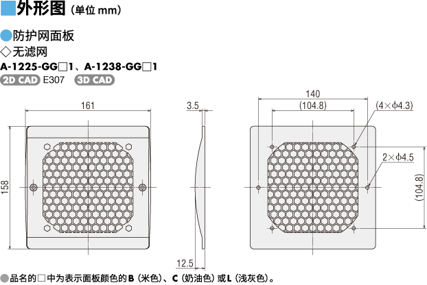 說明 面板(1片 顏色:淺灰)、鐵制防護網(wǎng)(1片)、風扇安裝用螺絲、面板安裝用螺絲的套件品。
