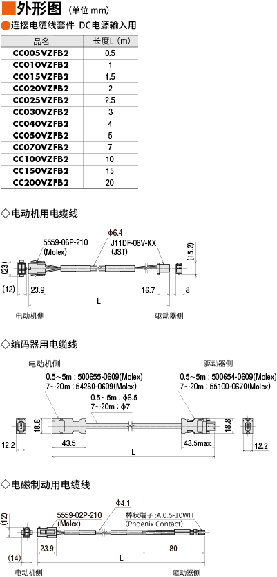 說明 電動機(jī)與驅(qū)動器間連接時必需的電動機(jī)用電纜線、電磁制動用電纜線套件。長度0.5 m