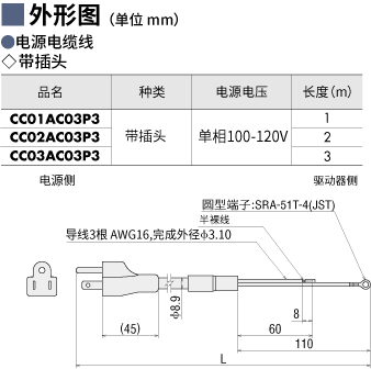 說明 用于連接AR系列AC電源輸入型用驅動器(單相)與電源的附插頭電纜線?!¢L度1 m