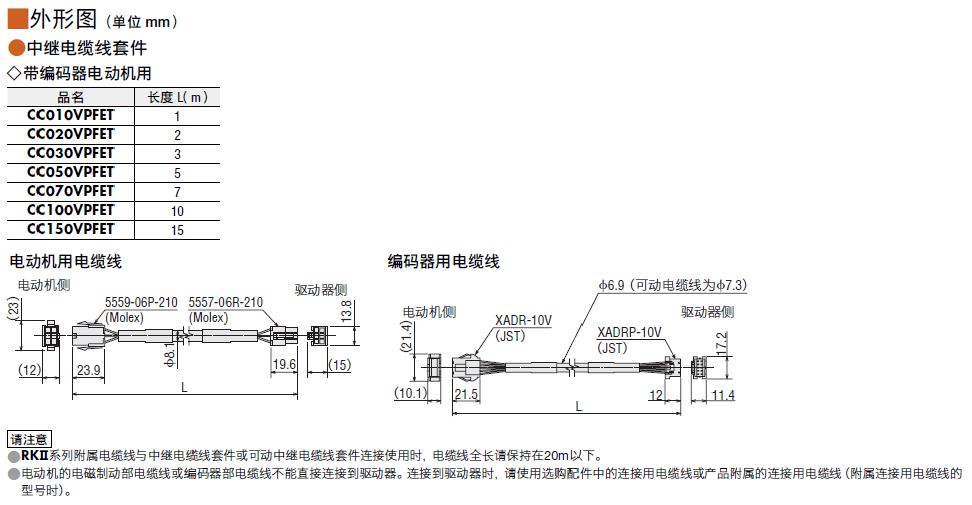 | 說明 | 電動機與電纜線間中繼時必需的電動機用電纜線、編碼器用電纜線套件。長度5 m |