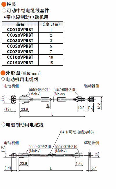 | 說明 | 電動機與電纜線間的中繼用可動電動機用電纜線、可動電磁制動用電纜線套件。請于電動機安裝在可動部,電纜線需彎曲時使用。長度5 m |