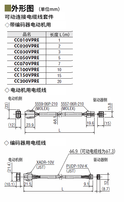 | 說明 | 電動機與驅(qū)動器間的可動電動機用電纜線、可動編碼器用電纜線套件。請于電動機安裝在可動部,電纜線需彎曲時使用。長度7 m |