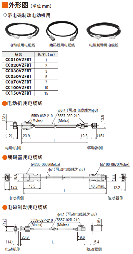 | 說明 | 電動機與電纜線間中繼時必需的電動機用電纜線、電磁制動用電纜線套件。長度7 m |