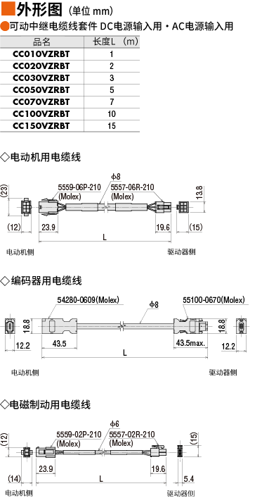 說明 電動機與電纜線中繼時必需的可動電動機用電纜線、可動電磁制動用電纜線套件。請于電動機安裝在可動部,電纜線需彎曲時使用。長度7 m