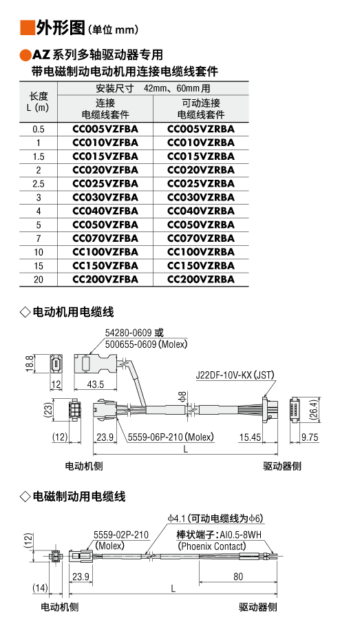 | 說明 | 安裝尺寸42 mm、60 mm的電動機(帶電磁制動)與驅(qū)動器間連接時必需的電動機用、電磁制動用電纜線套件。長度20 m |