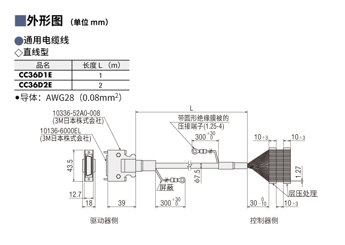 | 說明 | 電纜線一端配備了可與驅(qū)動器簡單連接的半間距連接器的附屏蔽電纜線。 |