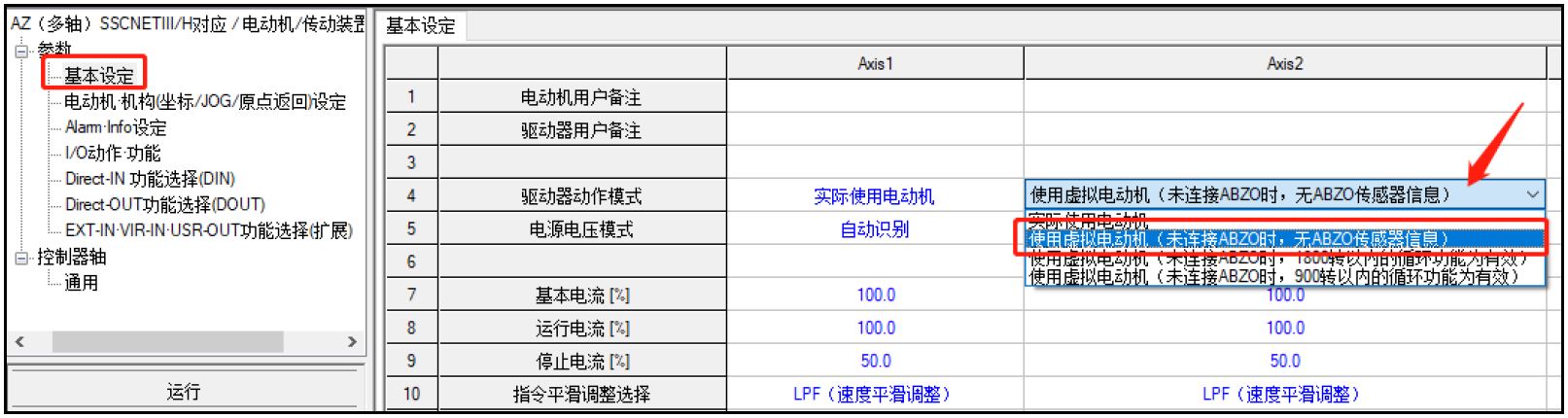 a.左側(cè)信息欄選擇“基本設(shè)定”→ 在需要設(shè)定的軸下“驅(qū)動器動作模式”修改為“使用虛擬電機(未連接ABZO時,ABZO編碼器信息)